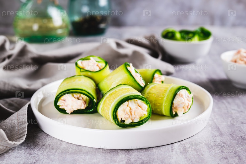 Аппетитные огуречные рулетики из салата из тунца, яйца и сыра на тарелке на столе