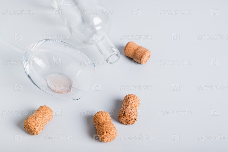 Отказ от алкоголя, пустой стакан, бутылка и пробки на сером фоне