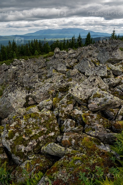 Курумник на хребте с видом на гору Денежкин Камень