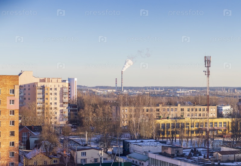 Типичный восточноевропейский город, увиденный через окно зимой. Концепция