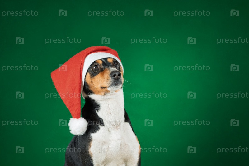 Портрет собаки басенджи в рождественской шапке Санта-Клауса на зеленом фоне