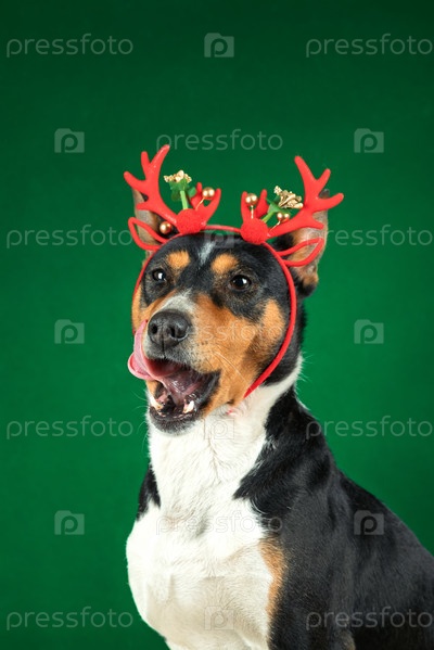 Крупным планом портрет забавной красивой собаки басенджи в костюме рождественского оленя на зеленом фоне