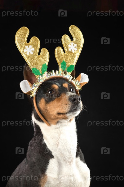 Крупным планом портрет забавной красивой собаки басенджи в костюме рождественского оленя на темном фоне