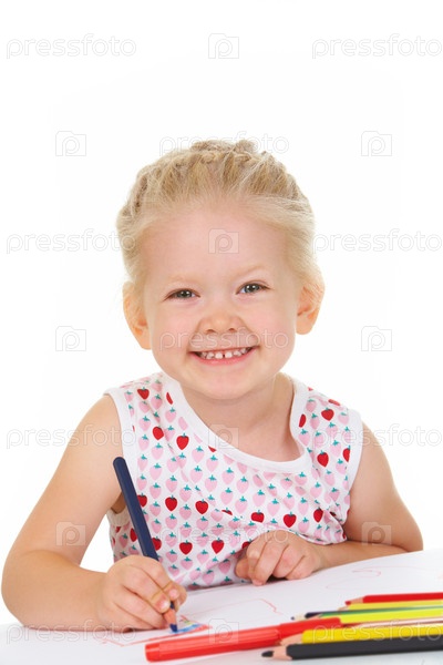 Рисующая маленькая девочка на белом фоне