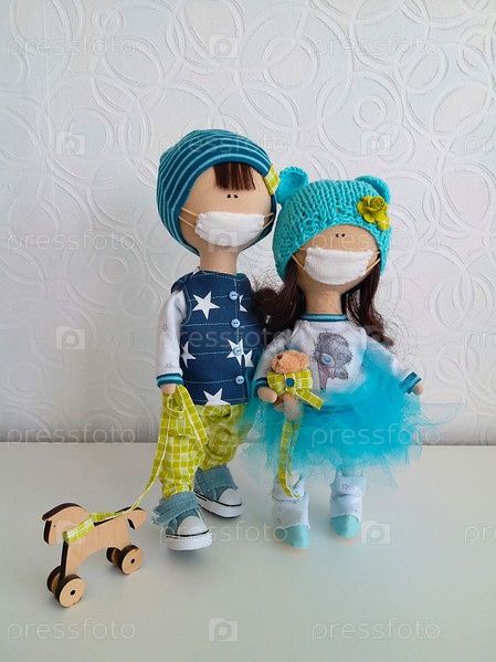Две тканевые куклы в защитных масках ведут игрушечную лошадку на колесах