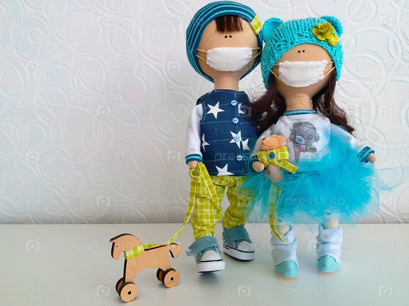 Две тканевые куклы в защитных масках ведут игрушечную лошадку на колесах