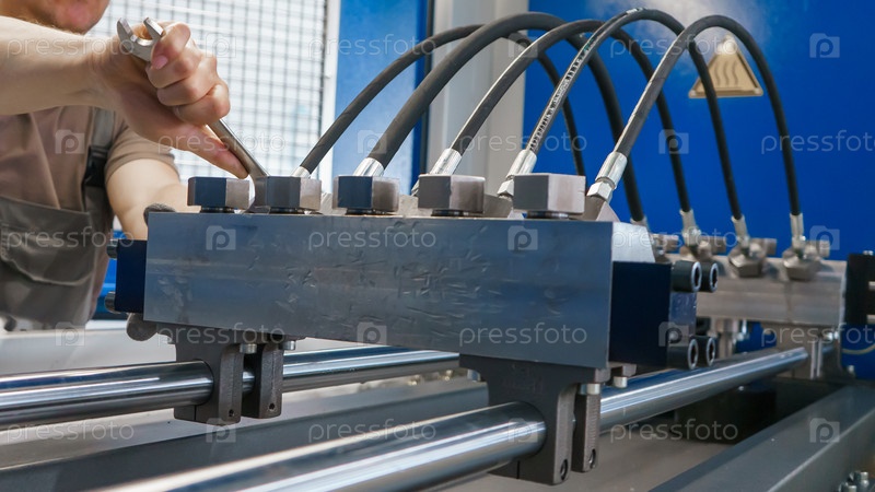 Мужчина устанавливает шланги высокого давления в испытательную машину. Контроль качества продукции