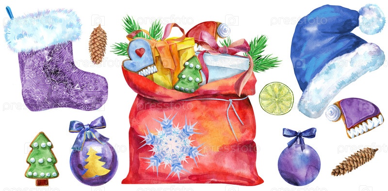 Санта-Клаус шапка, мешок, мяч и носок для подарка. Акварельная иллюстрация, изолированная на белом