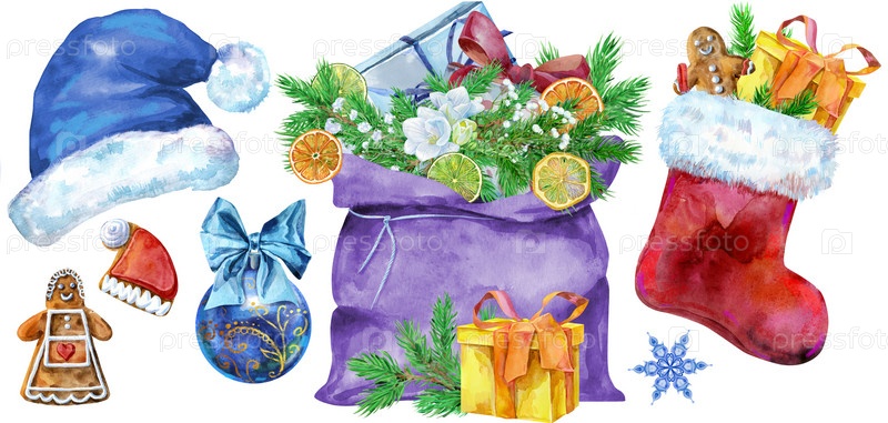 Рождественская шапка Санты, сумка, мяч и носок для подарка, акварельная иллюстрация