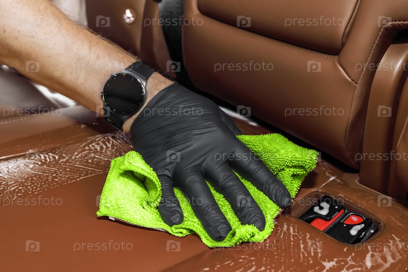 Мужчина в черных резиновых перчатках протирает салон автомобиля тряпкой, чтобы удалить грязь. Чистка салона автомобиля. Студия детейлинга