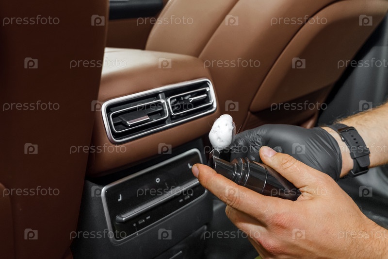 Чистка дефлекторов заднего пассажира пеной и щеткой. Роскошный современный коричневый кожаный салон автомобиля, климат-контроль, воздуховоды на панели автомобиля