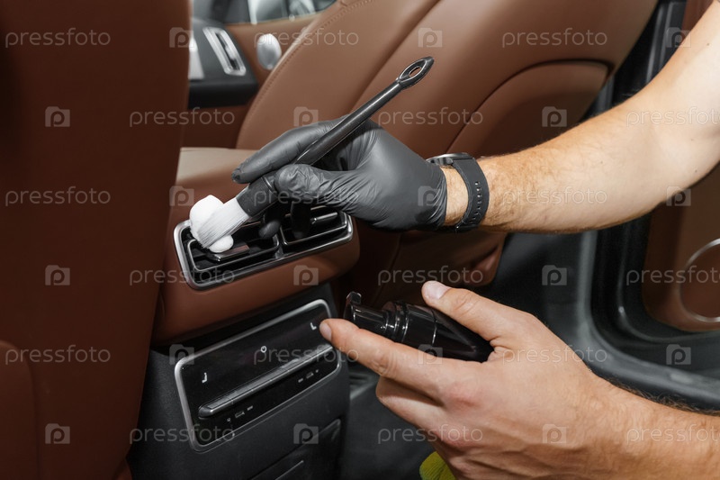 Чистка задних пассажирских дефлекторов пеной и щеткой. Роскошный современный коричневый кожаный салон автомобиля, климат-контроль, воздуховоды на панели автомобиля. Детали интерьера внутри крупным планом