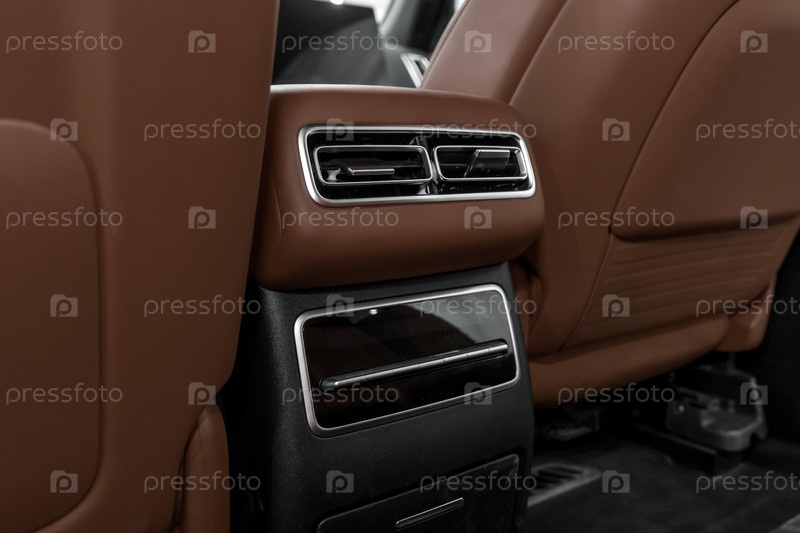 Обдув задних пассажиров на центральной консоли салона автомобиля. Дефлекторы для задних пассажиров. Роскошный современный коричневый кожаный салон автомобиля, климат-контроль, воздуховоды на панели автомобиля. Детали интерьера внутри крупным планом