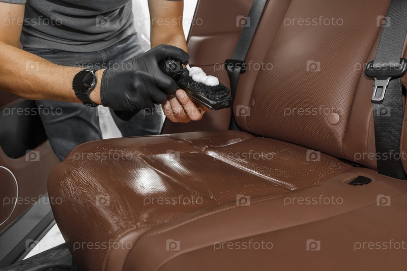Мужчина в черных резиновых перчатках выдавливает пену из дозатора на щетку, чтобы удалить грязь с сиденья автомобиля. Чистка салона автомобиля. Студия детейлинга