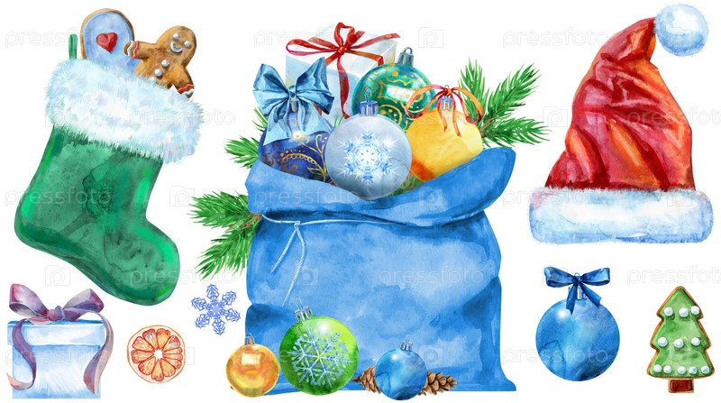 Санта-Клаус шапка, мешок, мяч и носок для подарка. Акварельная иллюстрация, изолированная на белом
