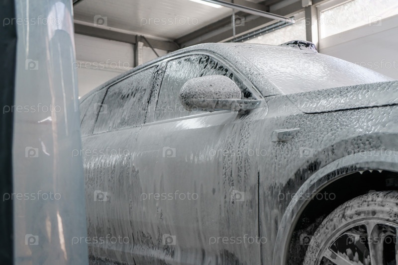 Машина в пене на автомойке. Густая пена на машине