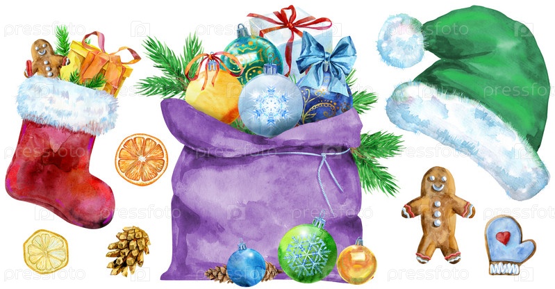 Санта-Клаус шапка, мешок, мяч и носок для подарка. Акварельная иллюстрация, изолированная на белом