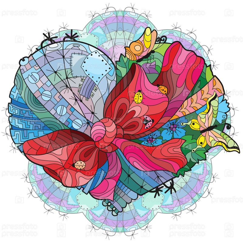 Векторные текстуры для взрослых раскрасок сердце, привязанное к узорчатой круглой подложке с лентой и бантом. Ручная роспись художественного дизайна