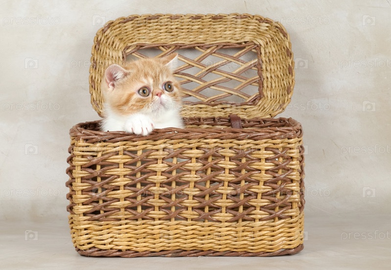 Рыжий экзотический котенок сидит в корзине на светлом фоне