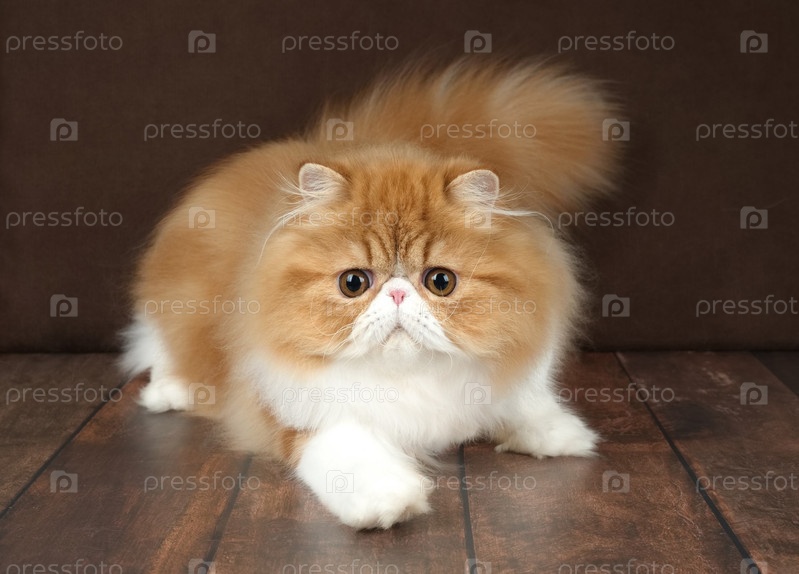 Портрет пушистого рыжего персидского кота на темном фоне в студии