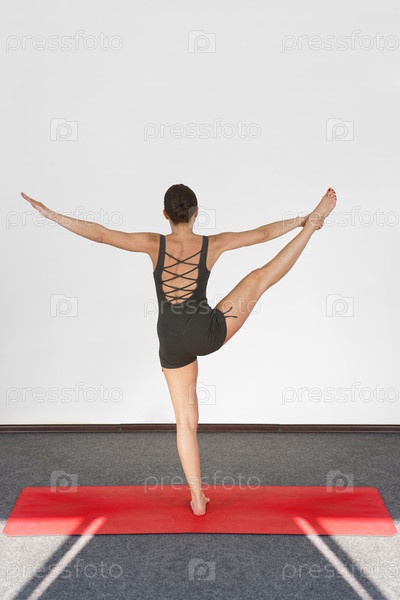 Растяжка, йога и женщина на красной дорожке для тренировки, упражнений. Ноги, растяжка и дама с гибкими фитнес-тренировками или пилатесом для баланса, медитации или хорошего самочувствия