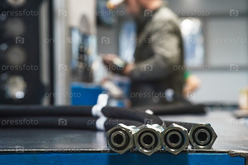 Рабочий собирает шланг высокого давления. Производство шланга высокого давления