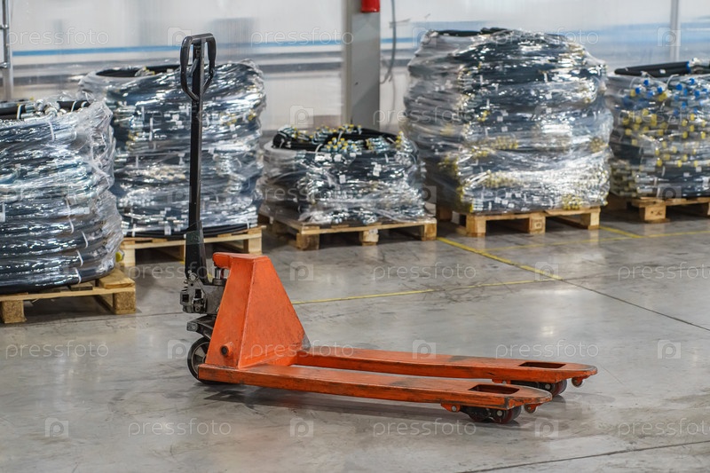 Укладка упакованных металлических рулонов на поддоны с помощью ручной тележки на просторном складе