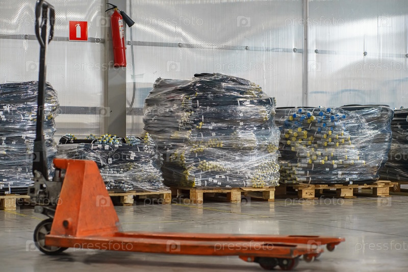 Укладка упакованных металлических рулонов на поддоны с помощью ручной тележки на просторном складе