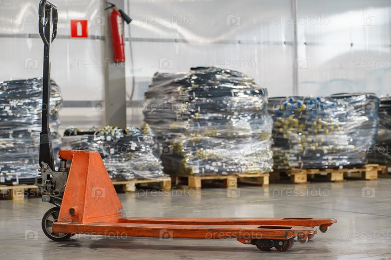 Ручная тележка с поддонами стоит рядом с высокой стопкой упакованных металлических катушек на поддонах на большом организованном складе, заполненном однотипными товарами