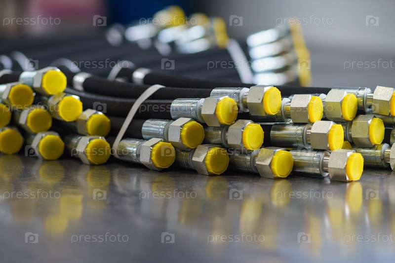 На металлическом столе лежит связка новых гидравлических шлангов высокого давления. Гидравлические шланги с желтыми заглушками. Готовая продукция
