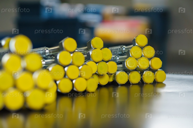 На металлическом столе лежит связка новых гидравлических шлангов высокого давления. Гидравлические шланги с желтыми заглушками. Готовая продукция