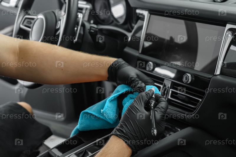 Мужчина в черных резиновых перчатках очищает салон автомобиля от пыли щеткой. Студия детейлинга