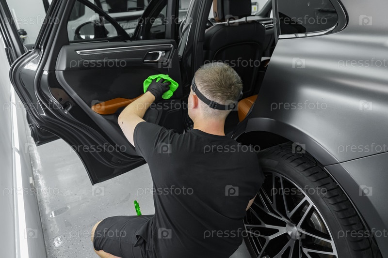 Мужчина в резиновых перчатках протирает внутреннюю часть двери автомобиля. Поддержание чистоты автомобиля. Детейлинг