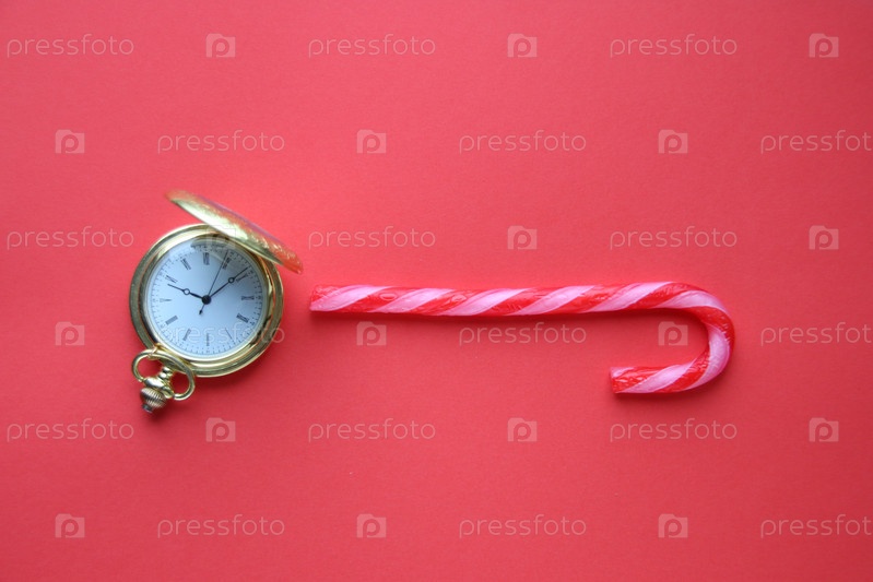 Веселая рождественская открытка. Конфета на красном фоне