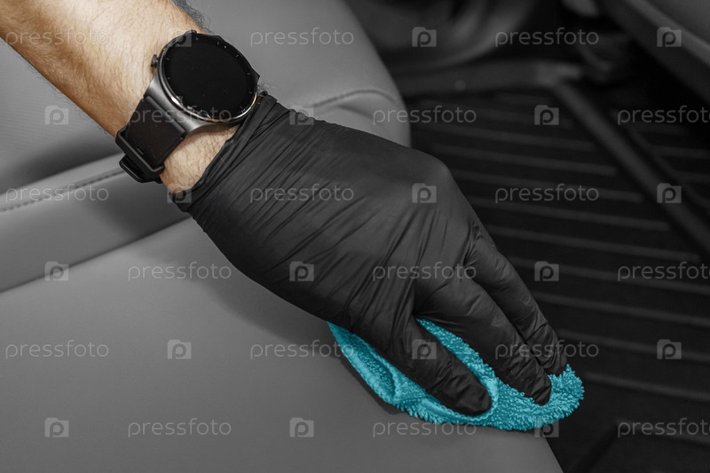 Мужчина в черных резиновых перчатках протирает салон автомобиля тряпкой, чтобы удалить грязь. Чистка салона автомобиля. Студия детейлинга