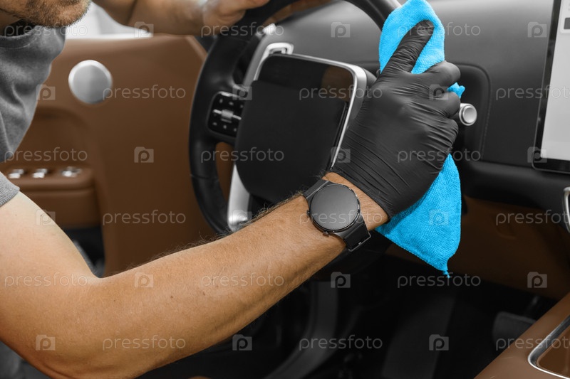 Мужчина протирает руль автомобиля синей тряпкой. Чистка салона автомобиля. Детейлинг