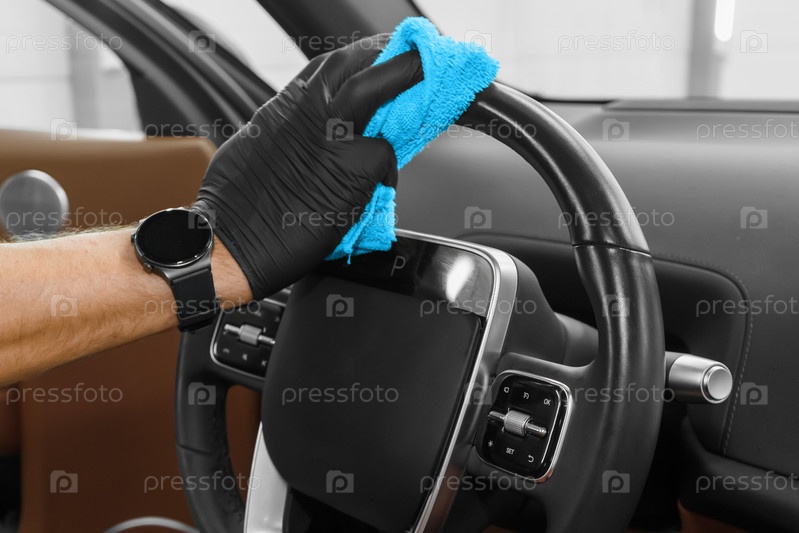 Мужчина протирает руль автомобиля синей тряпкой. Чистка салона автомобиля