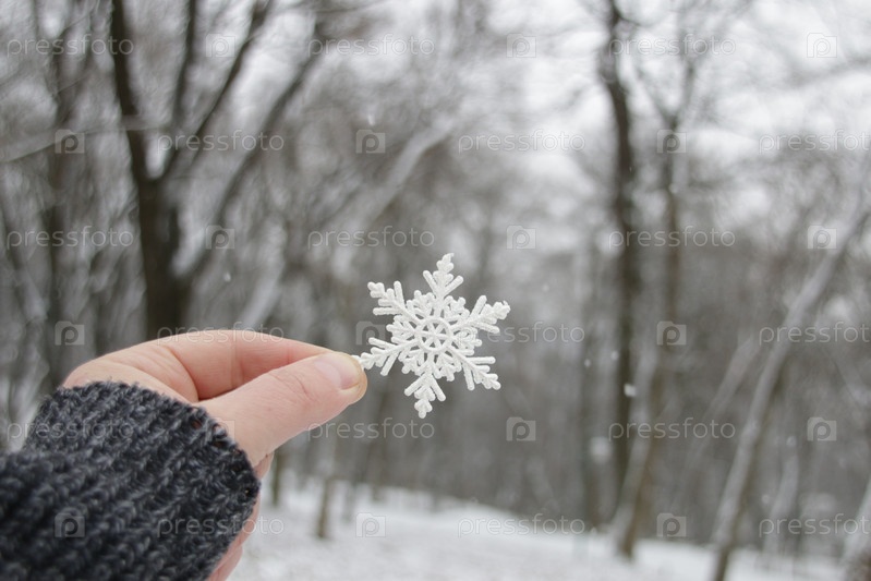 Рука держит снежинку на фоне зимнего леса. Зимний фон