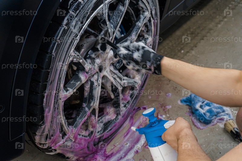 Профессиональная мойка автомобилей. Крупный план мойки колеса автомобиля щеткой и мылом