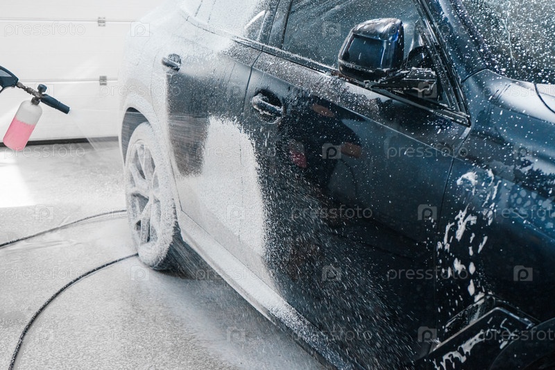 Нанесение пены на автомобиль на автомойке. Распыление пены на автомобиль с помощью пульверизатора. Моющее средство