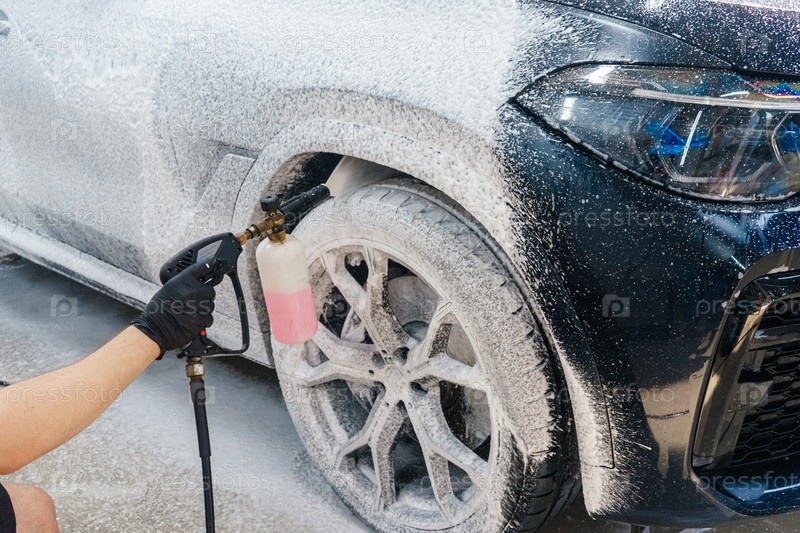 Нанесение пены на автомобиль на автомойке. Распыление пены на автомобиль с помощью пульверизатора. Моющее средство