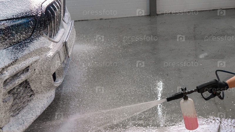 Нанесение пены на автомобиль на автомойке. Распыление пены на автомобиль с помощью пульверизатора. Моющее средство