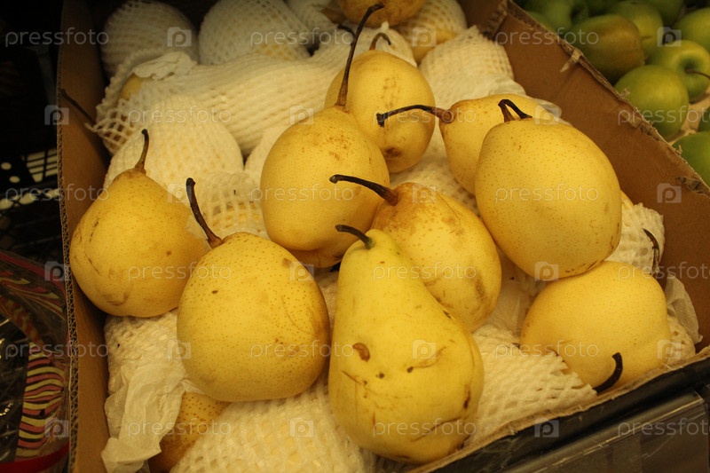 Большие желтые груши в картонной коробке в магазине Shop. Демонстрация и покупка грушевых плодов в магазине. Наличие фруктов