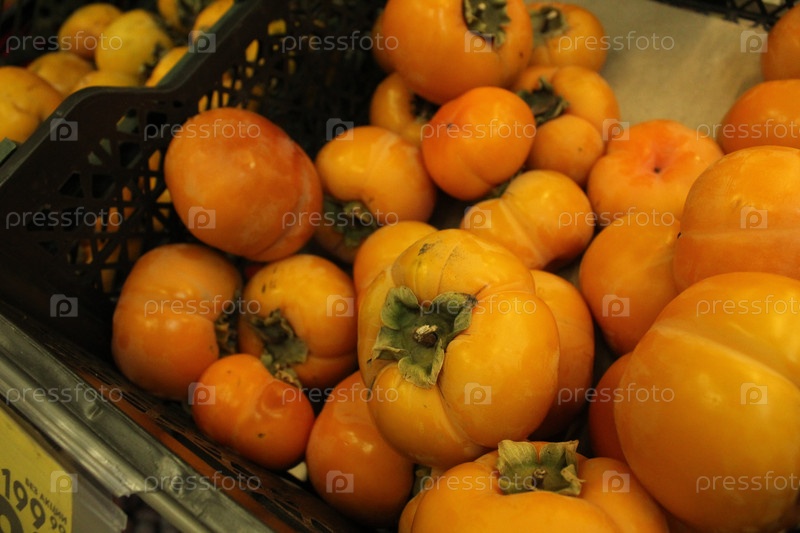 Хурма сорта каки, плоская хурма крупным планом. Сезонные фрукты в магазине