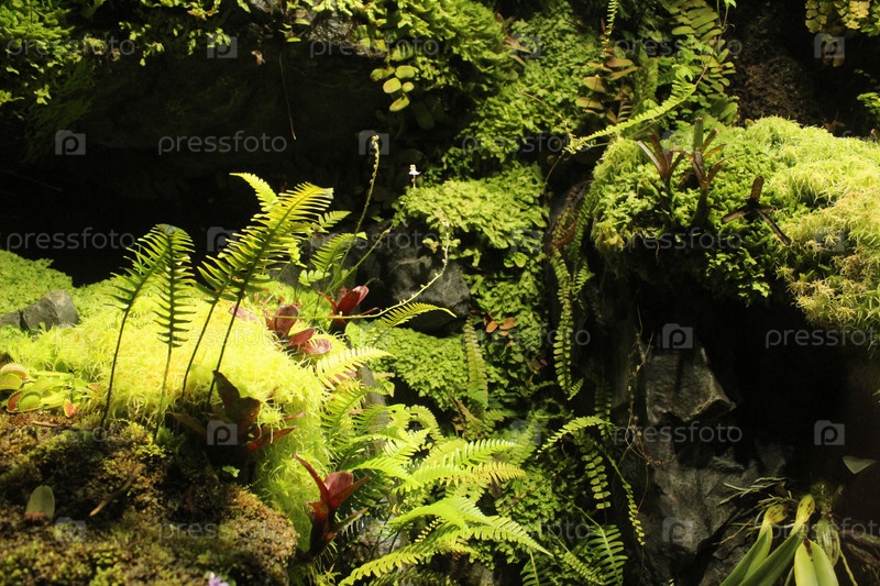 Зеленая трава, заросли, мох, папоротник в аквариуме. Организация жизни в аквариуме