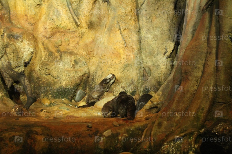 Lutra cinerea, Aonyx cinereus или Amblonyx cinereus играет у подножия камня
