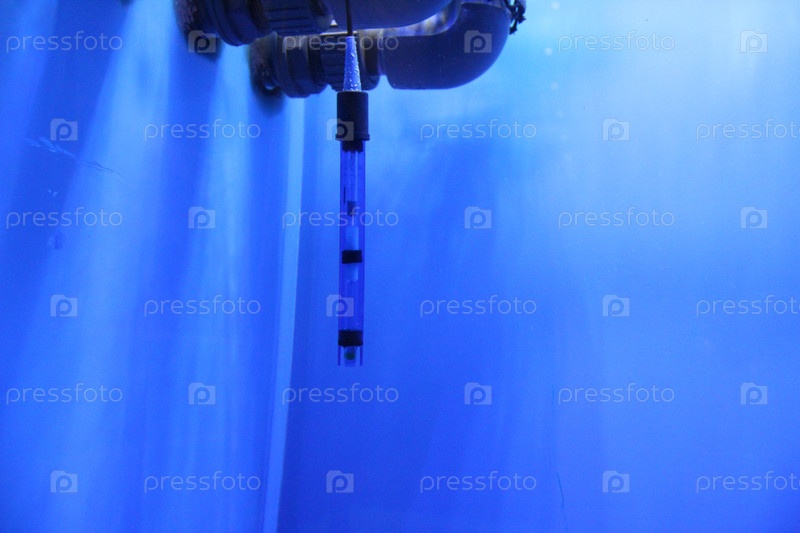 Термометр в аквариуме в синей воде. Измерение температуры воды