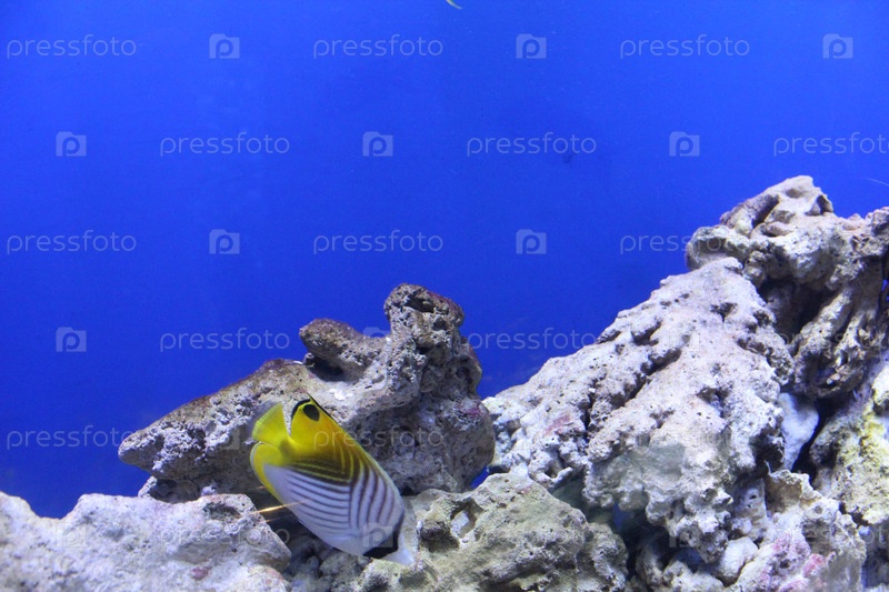 Рыба MHeniochus acuminatus Chaetodon auriga прячется возле камней