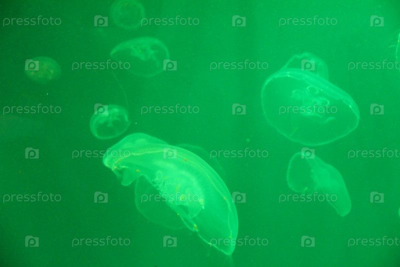 Множество медуз на зеленом фоне в воде. Морская жизнь