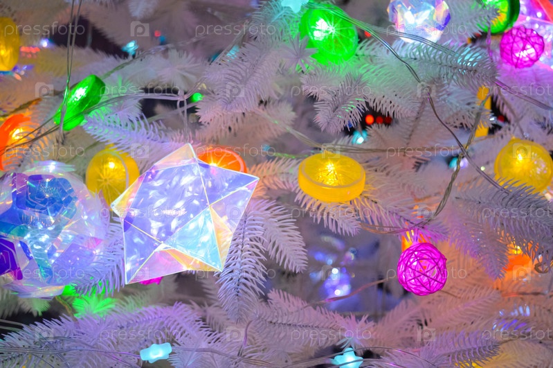 Рождественский фон с пушистой белой елкой и светящимися гирляндами игрушек